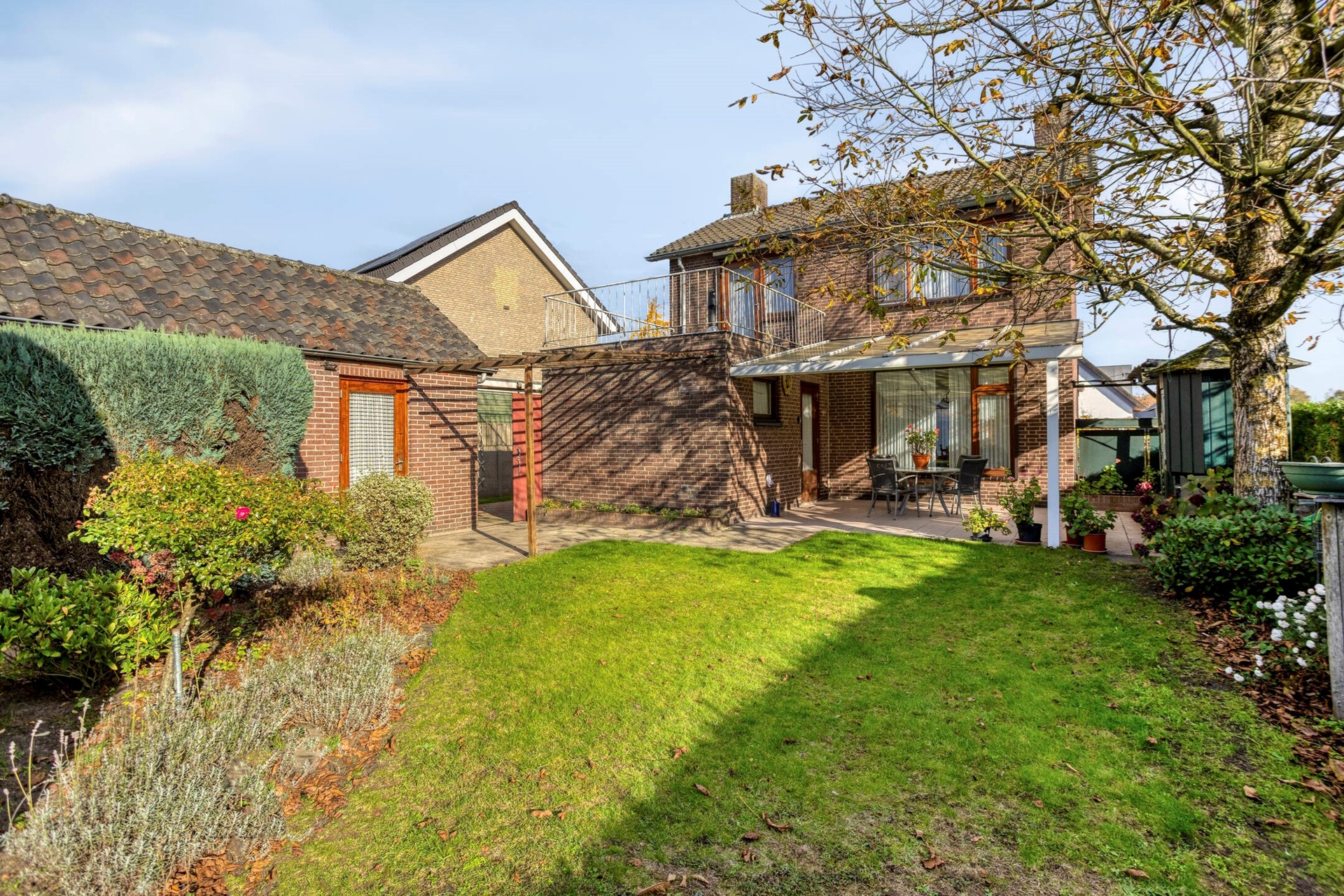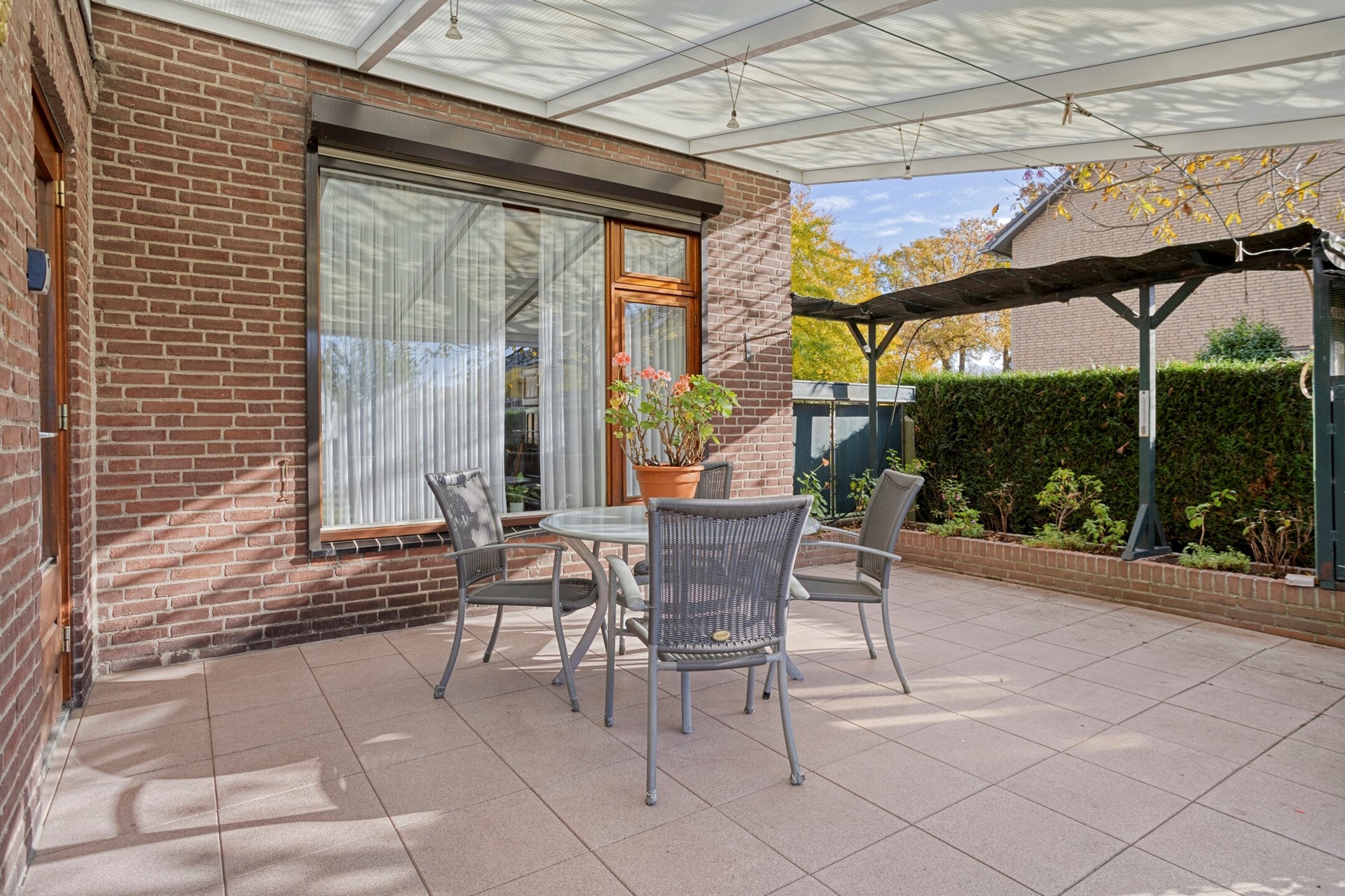Direct aan de woning bevindt zich een aluminium terrasoverkapping met polycarbonaat dakplaten. De vrije achtertuin is volledig omheind voorzien van een gazon en aangeplante borders met volwassen beplanting. Vanuit het overdekte terras middels een schuifpoort toegang tot de diepe en bestrate oprit, welke plaats biedt aan meerdere personenauto's.